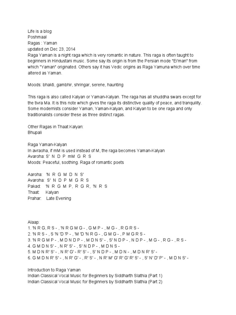 Raag Yaman Notes - It also talks about the seven basic (shuddha) notes of hindustani music (sa re ga ma pa dha ni sa'), the one tivra (relatively shart) note (tivra ma / augmented fourth) and how film songs, while based on a raag, often don't showcase.